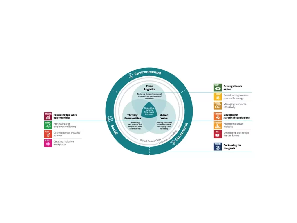 In our sustainability strategic framework, we’ve been very specific about our ambitions to develop logistics that are good for you and our planet. The model encompasses three building blocks: clean logistics, thriving communities, and shared value. And it is surrounded by two pillars: global partnerships, guidance, and policies.